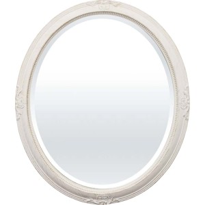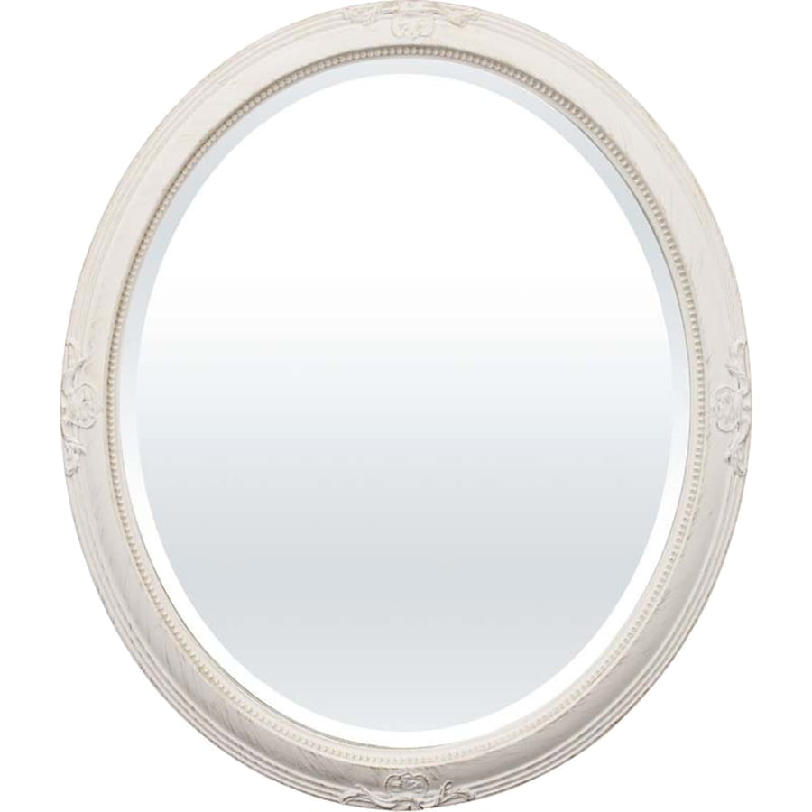 Owalne, fazowane lustro w białej, rustykalnej ramie.
