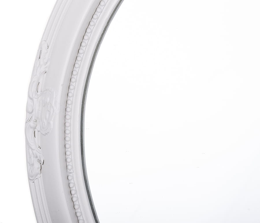 Rustykalne lustro wiszące o owalnym kształcie. Jego obramowanie stanowi połączenie drewna i wytrzymałego poliresingu, gwarantuje to odpowiednią ochronę eleganckiej, fazowanej tafli. Subtelne zdobienia ramy świetnie dopełniają styl dekoracji. Nasze białe lustro ma uniwersalny charakter, jednak zdecydowanie najlepiej komponuje się we wnętrzach rustykalnych oraz prowansalskich.