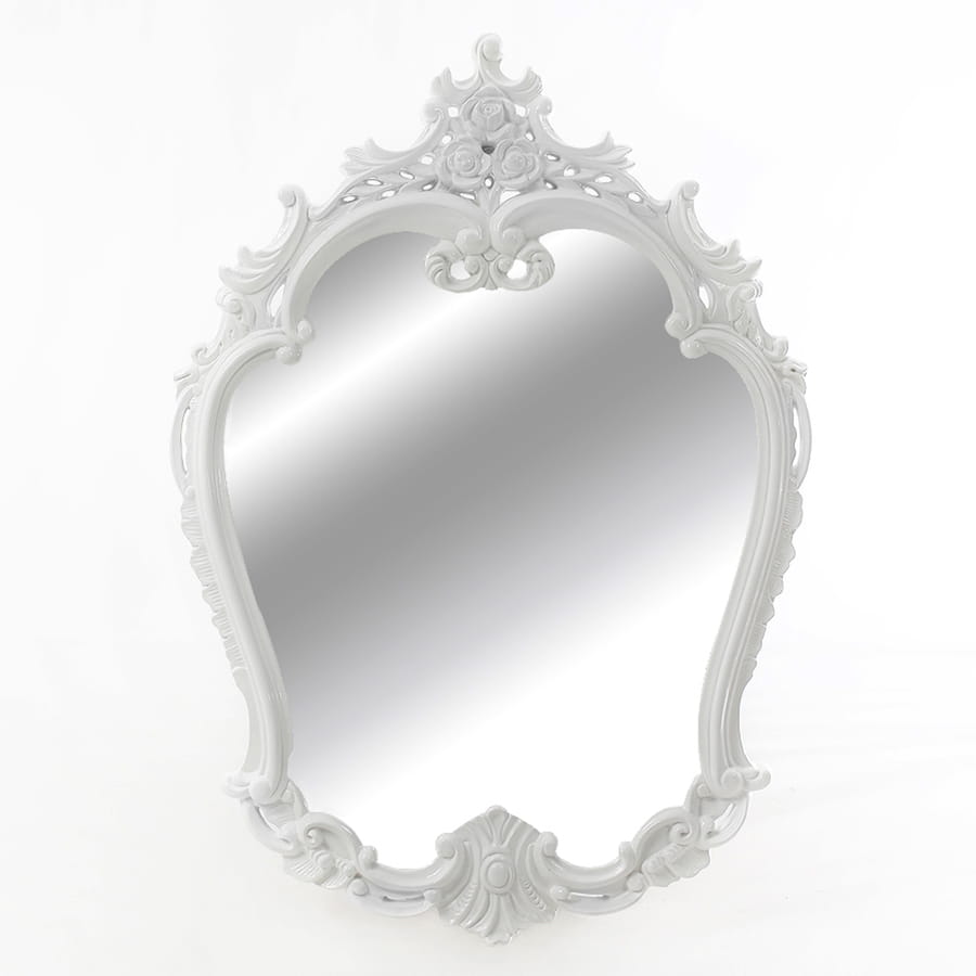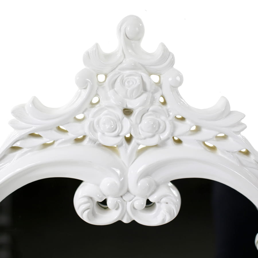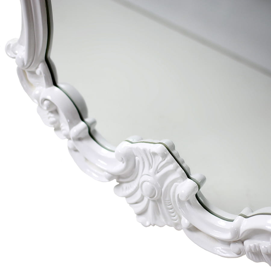 Lustro z tej pozycji składa się z przepięknie rzeźbionej ramy oraz fazowanej tafli. Obramowanie wykonano z wysokiej klasy tworzywa. Posiada ono rzeźbioną koronę, która nadaje całości niesamowitej elegancji. Dodatkowo dekoracja prezentuje się w białej barwie wspaniale dopełniającej jej kunszt.