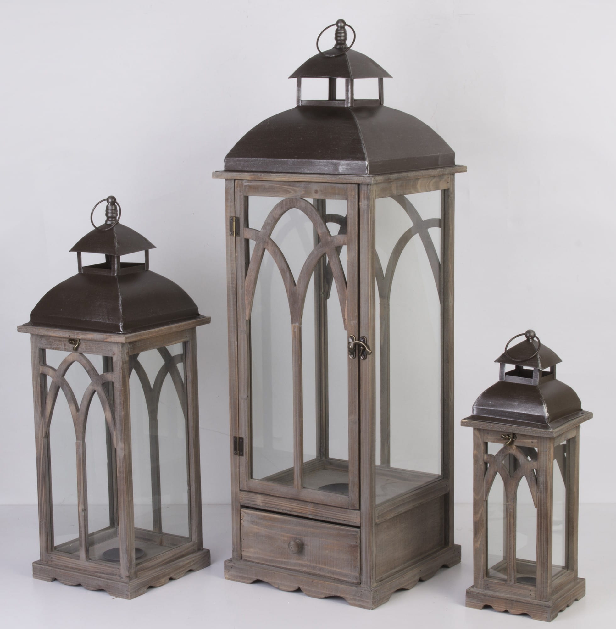 Wspaniały, duży komplet drewnianych lampionów w sposób idealny udekorują każde wnętrze, wprowadzą ciepły i przyjazny klimat. Lampiony posiadają przeszklenia z każdej strony oraz zamontowane na kominkach uchwyty do powieszenia.