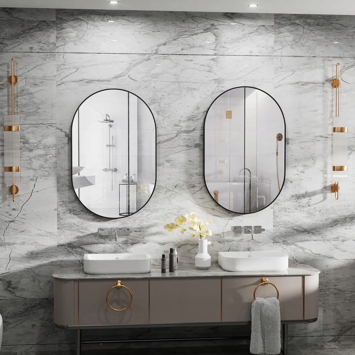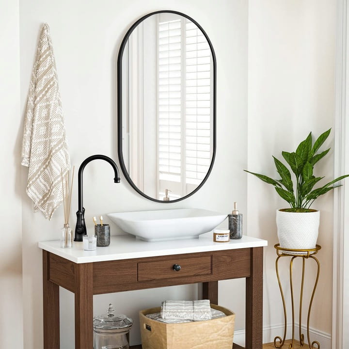 Łazienka – Dzięki swojemu rozmiarowi i stylowej, czarnej ramie, lustro wprowadzi elegancję do łazienki i będzie świetnie komponować się z metalicznymi i ceramicznymi dodatkami.