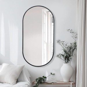 Stylowe czarne owalne lustro o wymiarach 100x50 cm, idealne do wnętrz w stylu loftowym. Jego minimalistyczna, aluminiowa cienka rama w głębokiej czerni doskonale podkreśla surowy charakter przestrzeni, dodając wnętrzu elegancji i przestronności. Lustro świetnie sprawdzi się zarówno w salonie, przedpokoju, łazience jak i sypialni, tworząc nowoczesny akcent. Połączenie prostoty i wyrafinowanego designu sprawia, że pasuje do różnych aranżacji, wnosząc do wnętrza lekkość i ponadczasowy styl.