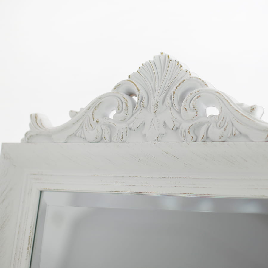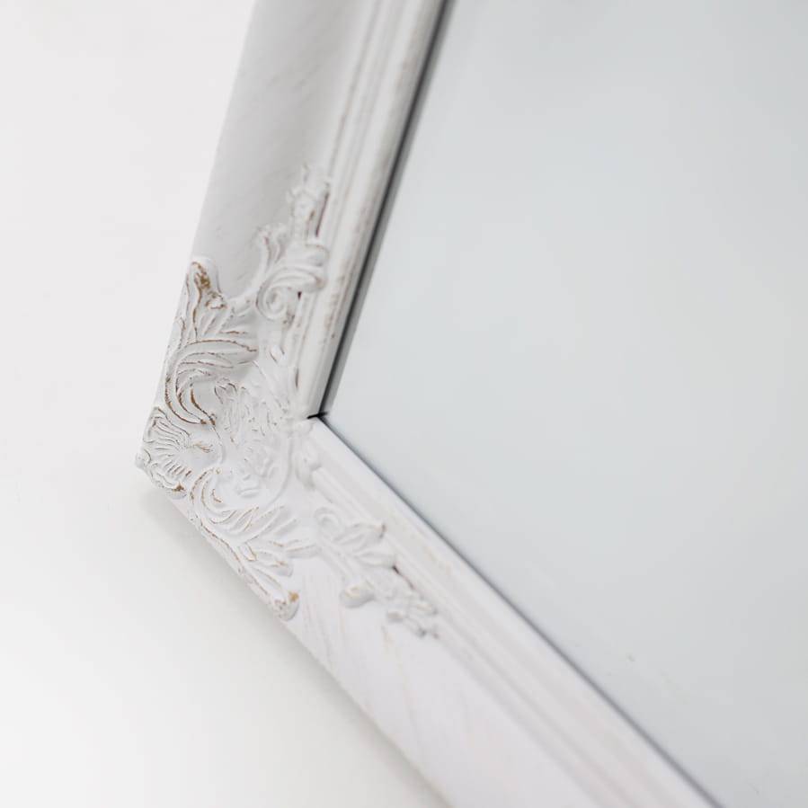 Lustro w prostokątnej, białej ramie. Obramowanie posiada koronę na szczycie, która tak samo, jak cała reszta jest postarzana metodą przecierania.