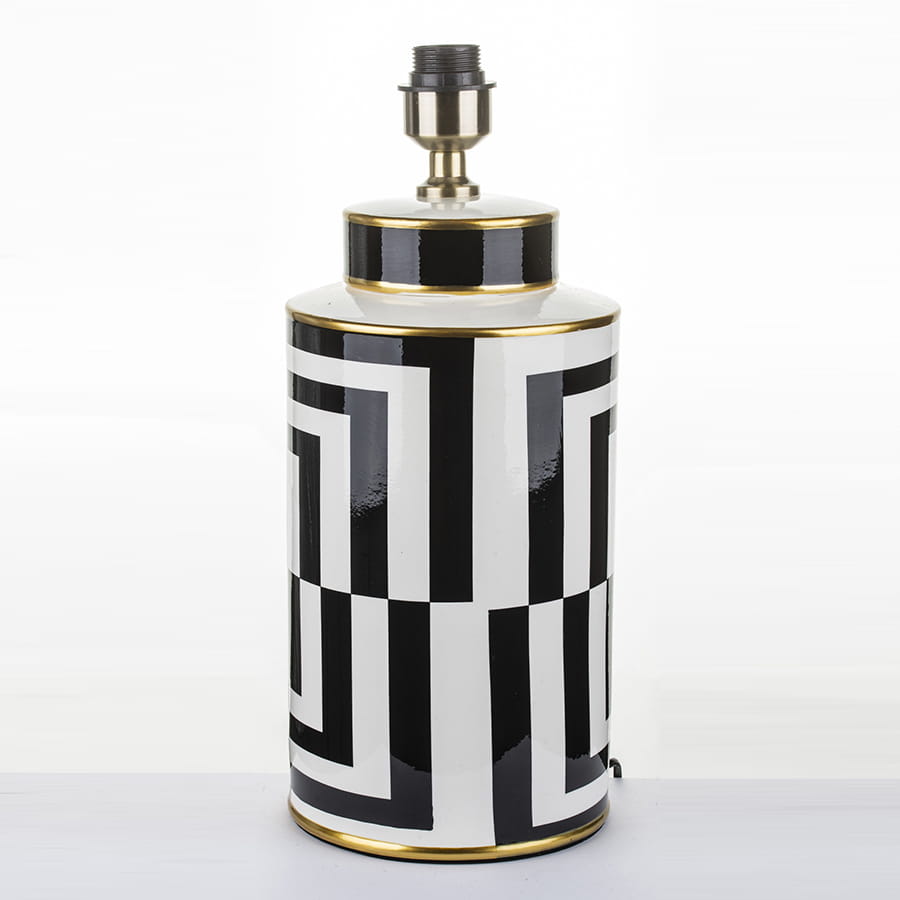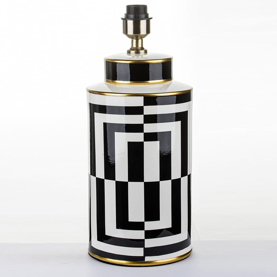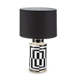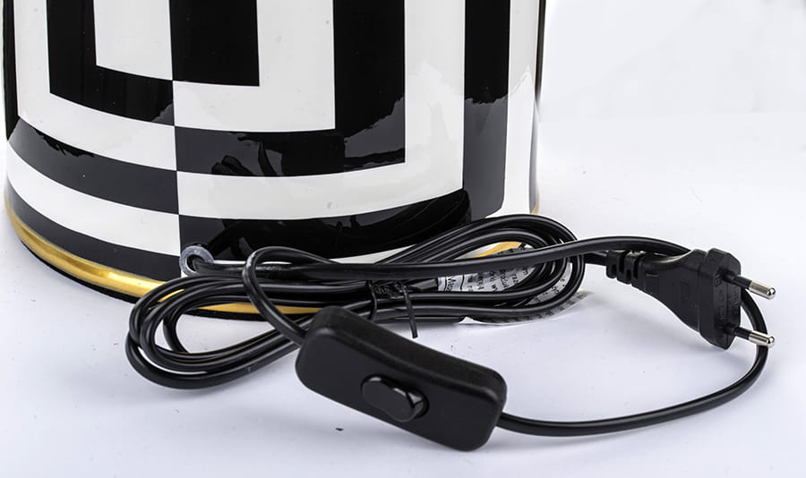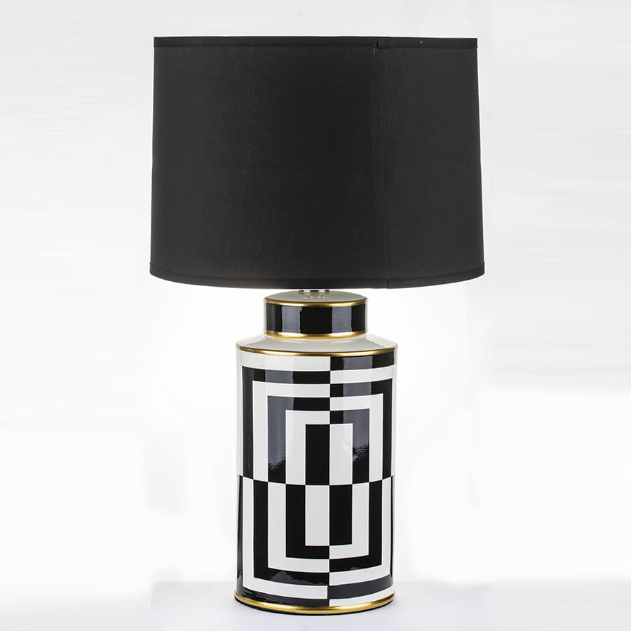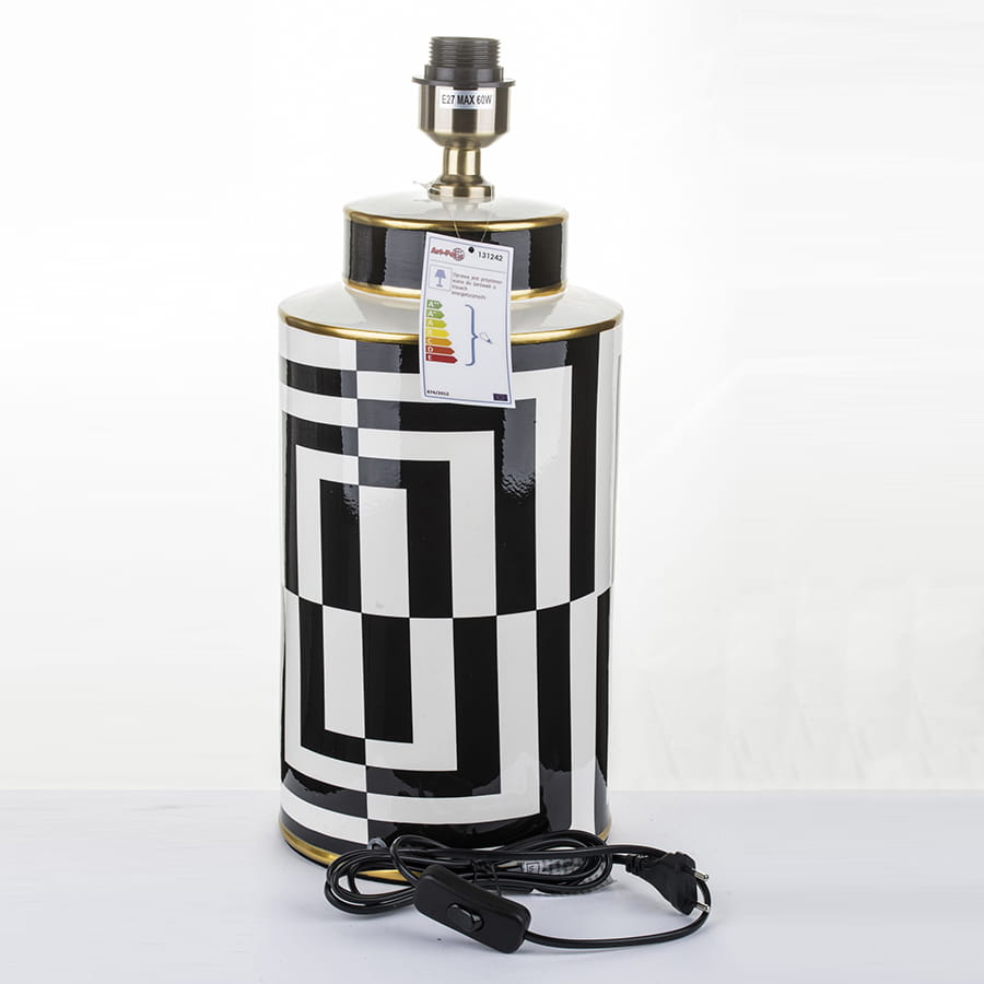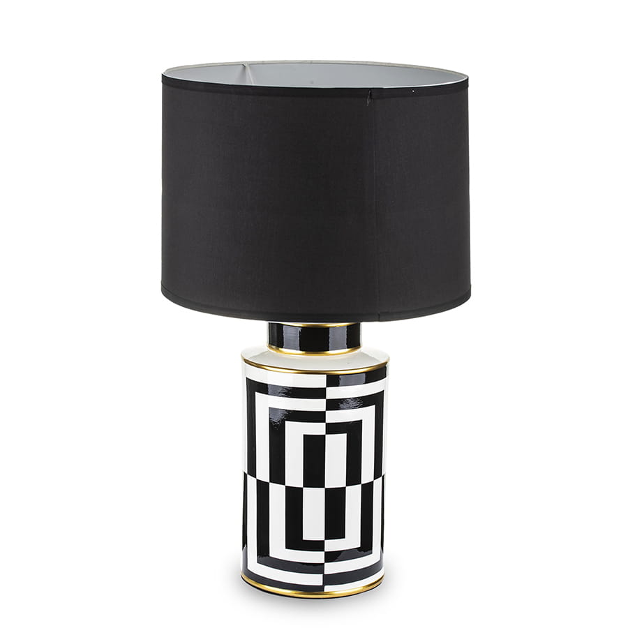 Nasza elegancka biało-czarna lampa jest doskonałą propozycją do stylowego salonu, sypialni, a także gabinetu! Składa się ona z dwóch części - podstawy wykonanej z ceramiki, którą ozdobiono nowoczesnym, biało-czarnym wzorem oraz płóciennego abażura barwy czarnej. Oprócz tego posiada ona cztery dekoracyjne paski koloru złotego, dzięki czemu lampa prezentuje się naprawdę szykownie.