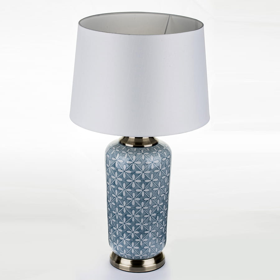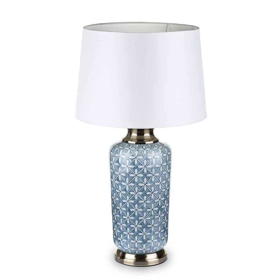 Ceramiczna lampa z niezwykle ciekawym wzorem dekoracyjnym. Jej podstawę wykonano z ceramiki, którą ozdobiono barwami białą, niebieską oraz srebrną. Abażur prezentowanej lampki jest płócienny. Nosi on kolor satynowej bieli. Warto również zwrócić uwagę na srebrne dodatki znajdujące się zarówno w górnej, jak i w dolnej części podstawy. Nasza lampka doskonale spełni swoją rolę nie tylko w salonie, czy sypialni, ale także w gabinecie!