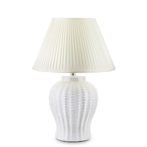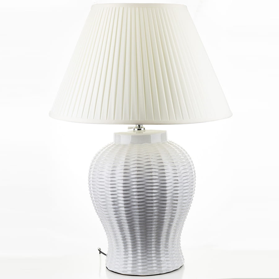 Elegancka lampa z ceramiczną nogą. Jest to duża dekoracja, która bez wątpienia zwróci uwagę każdego. Noga lampy prezentuje się w kolorze białym, a udekorowana jest nowoczesnym wzorem, z kolei płócienny abażur wpada w delikatne ecru. Świetny dodatek zarówno do stylowego salonu, jak i przestronnego gabinetu.